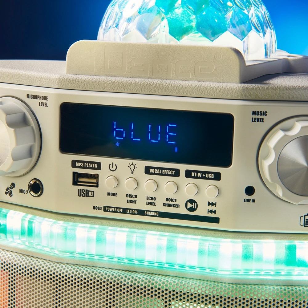 Be the star of your own show with the iDance Party Groove Karaoke Machine X2, a 9-in-1 Karaoke Party System with crystal clear sound and extra bass! With wireless Bluetooth connectivity and a dock for mobile devices, play your music your way. Connect via the USB port to play MP3 songs, or use your smart device to start the party.