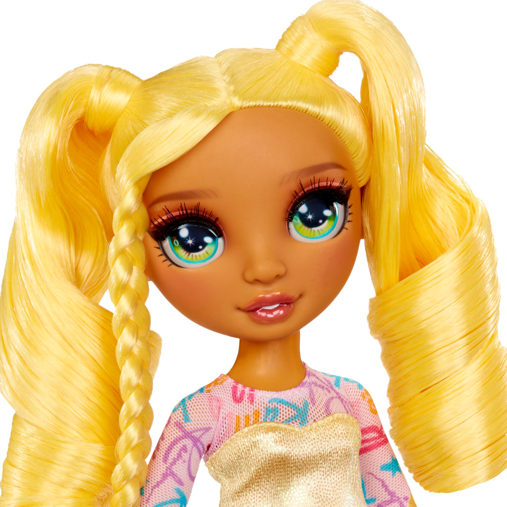At Rainbow High, everyone has their own unique style! In this iconic My Fashion Style fashion collection, Sunny Madison shines in radiant yellow from head to toe, with her dazzling signature fashion, and long brushable yellow hair styled into playful ponytails.