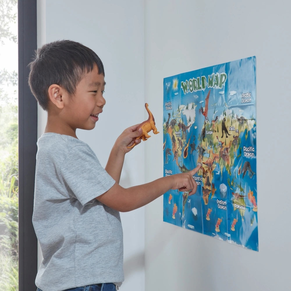There's a fabric play mat, perfect for anytime, anywhere imaginative adventures, and a colourful world map packed full of cool dinosaur information! This handy play set also includes landscape accessories, with trees and rocks to create unique playtime settings.