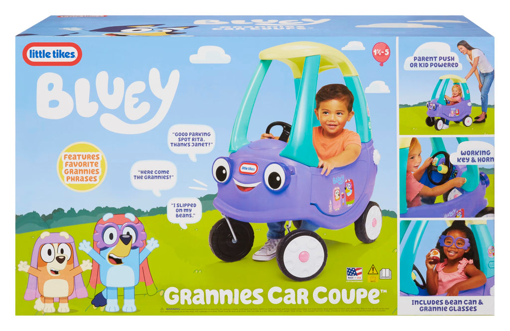 The Little Tikes Bluey Grannie's Car Coupe adds a touch of magic to the iconic ride-on toy car. The coupe is decorated with adorable Bluey decals and includes a pair of Grannie glasses and a can of Baked Beans, a Bluey favourite!